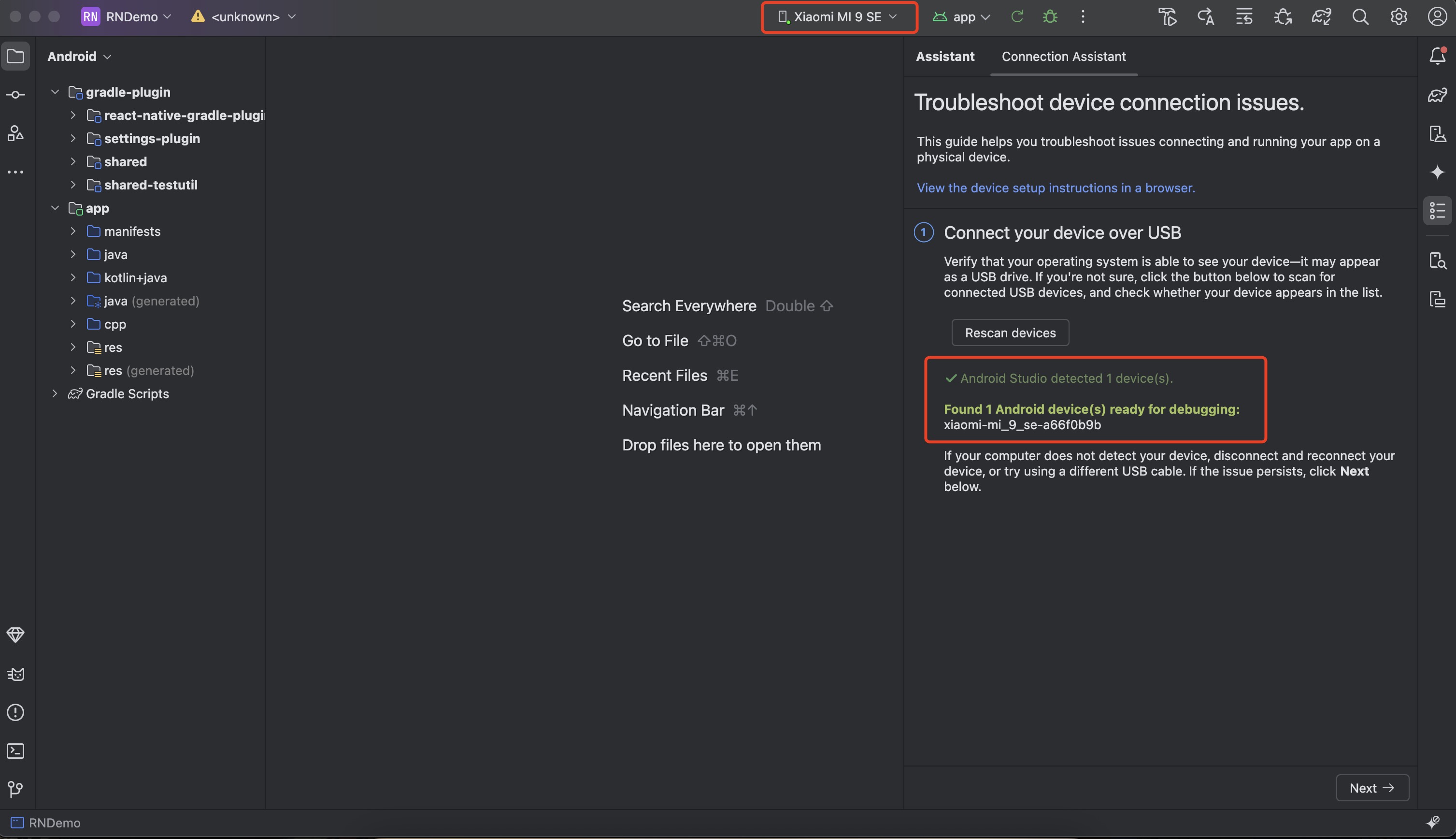a66f0b9b devicea66f0b9b就是设备ID,在Android Studio可以看到识别到的设备