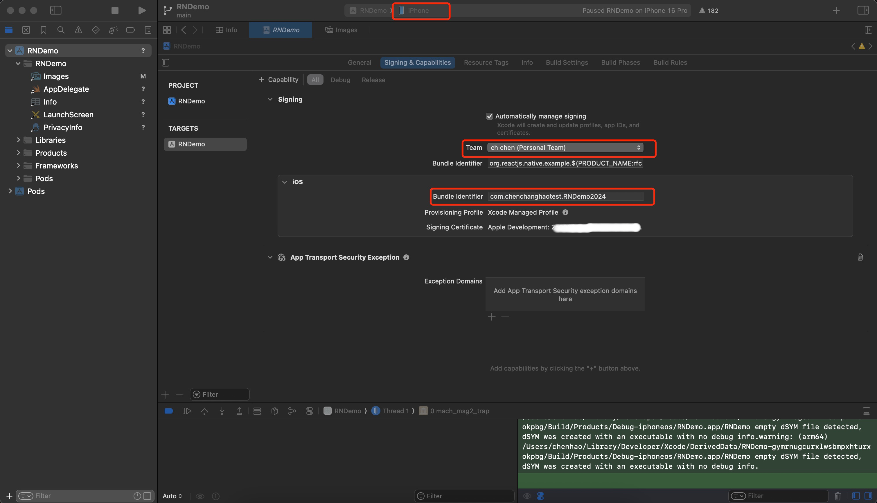 - 进入XCode,选择项目,在右侧Team选项加入刚才注册的开发者账号,并且将IOS选项中的Bundle Identifier修改一下,与上方的Bundle Identifier不重复即可,否则会报错,将顶部选择为运行到iPhone,点击运行