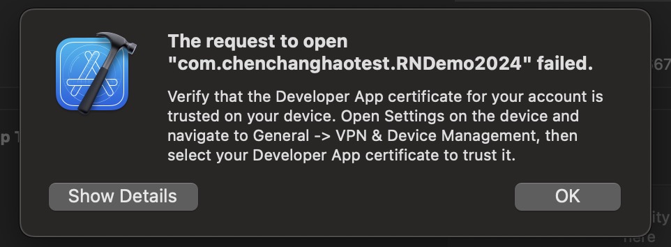 表示调试程序不被iPhone信任,需要进入iPhone设置依次进入“通用->VPN与设备管理->选择当前开发者APP->点击信任”,现在程序应该就可以运行到iPhone上了,摇晃iPhone点击Open DevTools可以在电脑端打开调试工具。